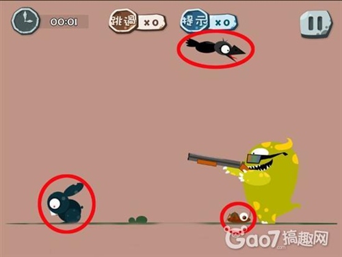 通關攻略:殺死圖中所有動物,小怪獸就會被一只黑手捏死。