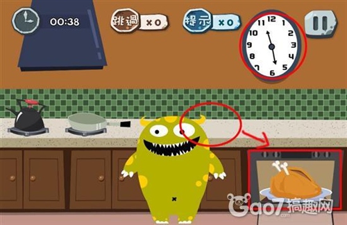 通關攻略:1.將桌子上的雞放到微波爐中,關上微波爐後將時鐘時間跳到11.28分這樣雞就會熟了。2.點擊小怪獸去取熟了的雞,在取出後搖晃設備小怪獸就會滑到被雞砸到噎死。