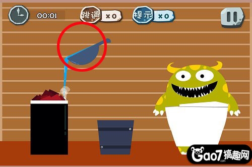 通關攻略:小怪獸在桑拿房中。我們只要將瓢子裝滿水倒在碳上(將瓢子遇到碳火上方松開即可)反復4死小怪獸就會被蒸熟。